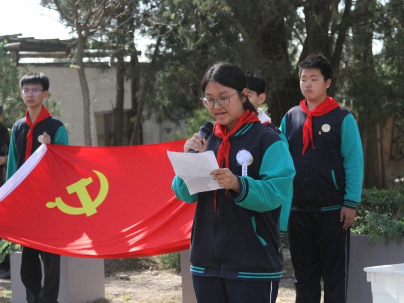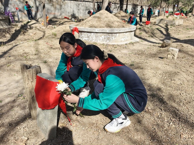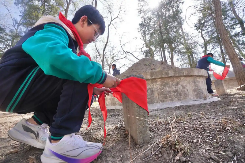 学生代表朗诵祭文,并表态要认真学习,成为国之栋梁,把对革命先烈的追思,转化为奋发进取的动力。党员代表献上了诗朗诵,守墓人孙连元为学生们授课,讲述党史故事,弘扬先烈的崇高精神。随后,大家满怀崇敬之心为烈士扫墓,敬献红领巾和鲜花。