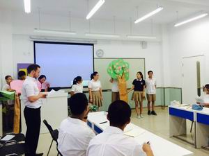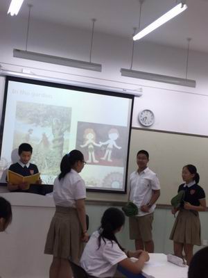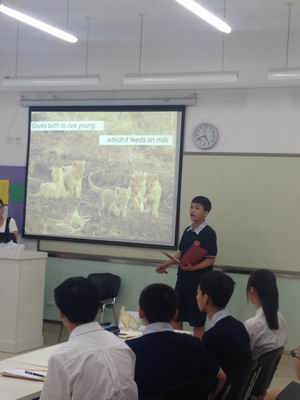 不到八点,初中双证班的家长们就陆续走进教学区。干净明亮的教室,现代化的教学环境,各有千秋的班级文化,这一切都给他们留下了深刻的印象。八点整,展示活动开始了。此次展示分为中、英文两个环节,以学生为主导。英文部分,同学们分别从数学、科学和传统文化三个大方面展示了自己所学的知识。首先是英数老师Allison设计的quiz show环节,赵轩民同学像专业主持人一般幽默风趣地介绍了参赛双方并开启了整个quiz show;大家全神贯注,争取答好每一道题。接下来的科学课中,同学们用事先做好的树和花朵的模型生动形象地介绍了植物的生命周期和动物的特点与生活习惯。最后,孙泽林、张子璐、赵轩民等同学用PPT展示加演讲的方式分别从中西文化和科学的角度探讨了地球上生命的起源。同学们落落大方的姿态、地道流利的英语都得到了家长和老师们赞许的目光。值得一提的是,在讲述过程中,同学们还像小老师一样积极与听众互动,深入浅出、诙谐幽默的语言让听众感到轻松愉悦。