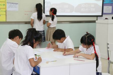 一、二年级的数学课堂主要采取了个人展示、分组活动、集体制作等形式,来对知识进行整理与复习。其中,一年级教师们以童话的形式展开整个活动。老师带着学生们坐着神奇的校车,通过寻找神秘的数字钥匙打开城堡大门,走进数字王国。王国里的成员以自我介绍的形式,与同学们交朋友;学生们分成红黄蓝三队,为王国里的成员排顺序;三名队长带领队员帮助国王寻找王国里隐藏的数字;学生们和国王一起制作礼物,先计算卡片上的数学题,然后根据答案把对应的图片贴到卡片上,最后写上心里话送给爸爸妈妈。二年级的数学课则以生活为题材——老师带领学生们进入“超市”购物,从学生选自己喜欢吃的食物出发,一环一环引出要复习的知识内容。分小组比赛,集体闯关,通过努力和计算最后获得心仪的食物,孩子们与家长共同分享着学习成果。三年级采取竞赛的形式,同学们分为3组,比赛解决数学问题,小组之间还可以轮流互相出题;此外,每个小组还由学生代表充当小老师进行讲解。老师则将课堂完全给予孩子们,只是根据同学们的具体表现情况和解题情况进行打分,最终评出一、二、三等奖。