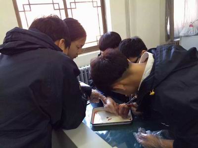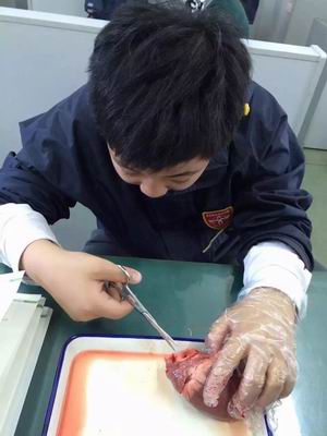 在中方生物老师的带领下,双证初一的同学们进行了心脏观察实验。来到实验室,桌上已摆满了准备好的镊子、夹子等实验器具,以及用来观察的动物心脏。孩子们好奇地坐在自己的位置上,十分认真的听老师讲解关于心脏的知识,并积极地提问。实验过程中,孩子们戴上手套、将手放在作为标本的动物心脏上,感受心脏的心室壁和心房壁,比较了它们的薄、厚度,并仔细地辨认了左、右心房的位置。接下来,在老师的指导下,同学们用刀割开心脏的心室,观察血管等内部构造。整个实验过程中,孩子们十分认真并积极地进行记录,课后还进行了热烈的讨论,纷纷感叹生命的奇妙!