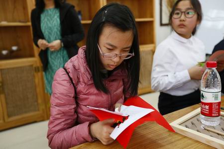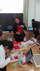 同学们分成两组,分别参加了剪纸与木工课程,每项课程大概两小时。走进剪纸教室,桌子上早已摆放好了剪刀、胶水、红纸以及装裱画框等。老师先为大家讲解了中国民间剪纸的历史发展,展示了传统花纹图样和常见的一些图案,以及剪纸图案中蕴含的民俗特征和文化含义。接下来,老师为大家现场演示了怎样剪“囍”字。按照老师传授的口诀,同学们很快就成功剪出了第一个作品。随后,老师又拿出一个“金鸡报晓”的图样,继续教给大家一些用剪刀的技巧,并给每位同学都做了单独的指导。大家一边动手,一边体会;不一会儿,一只只形象鲜明的大公鸡就跃然纸上了。最后,老师帮助大家亲手装裱了自己的作品,为大家的体验活动做了总结,还和大家合影留念。