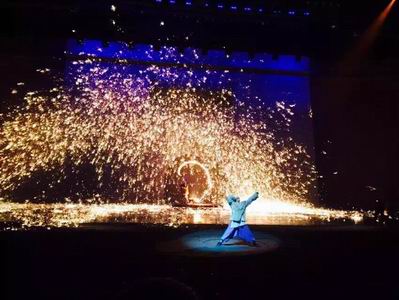 接着,大家乘车赶往第二个目的地——位于河北省蔚县的暖泉古镇。这里有着历时500多年的传统民俗文化活动、河北省省级非物质文化遗产——打树花。打树花,指的是身穿羊皮袄、头戴斗笠的艺人们,用特制的木勺将高温下融化的铁水用力泼洒在坚硬的城墙上;1000多度的铁水打在冰冷的墙上,迸溅出朵朵璀璨的火花,串起来呈树冠状,犹如枝繁叶茂、万花绽放的树冠。连著名的唐代诗人李白,都曾在《秋浦歌十七首》中盛赞了这项民间艺术活动:“炉火照天地,红星乱紫烟。赧郎明月夜,歌曲动寒川。”同学们出发之前就对传说中的奇绝打树花表演有所耳闻,一路上充满了期待,完全忘记了旅途的疲惫。晚上7点,同学们准时来到剧场,观看演出。一走进表演大厅,同学们就被极具地方特色的舞台布置所吸引了;而在亲眼观看了打树花表演后,同学们更是惊叹不已、赞颂不已、激动不已。每个人都拼命地按下快门,拍照留念;并在表演结束后,报以极其热烈的掌声和叫好声。不少同学纷纷表示,回家后一定要给家人们看一看照片,讲解一下这精彩的表演,与家人分享观看演出后的深刻感触。