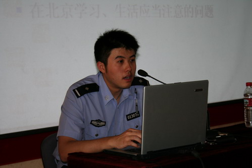 2009年5月19日中午,我校邀请北京市出入境管理处留学生办公室刘松涛警官到我校对外国学生进行法制宣传。刘警官针对外国学生特点,就签证政策和日常安全以及防范措施进行了详细讲解,让学生充分了解中国的法律法规,增强法律意识,同时也促使学生了解并防范身边可能存在的安全隐患,提高防范意识。