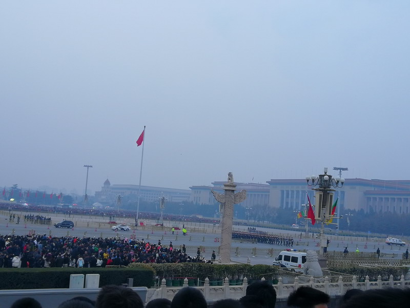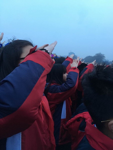 当汽车依次穿过天安门城楼的拱形门洞时,同学们深刻感受到了城楼的宏伟壮观。下车后,在工作人员的带领下大家有序地爬上了观礼台,整理队伍,静静地注视着国旗即将升旗的方向。四十分钟后,仪式开始了。解放军仪仗队迈着整齐的步伐和嘹亮的口号走到了旗杆下,国歌奏响,战士们用庄严的军礼将国旗缓缓升起,同学们也都随之敬队礼,而此时太阳在东方点亮,鲜艳的五星红旗在晨光的映衬下显得格外神圣!