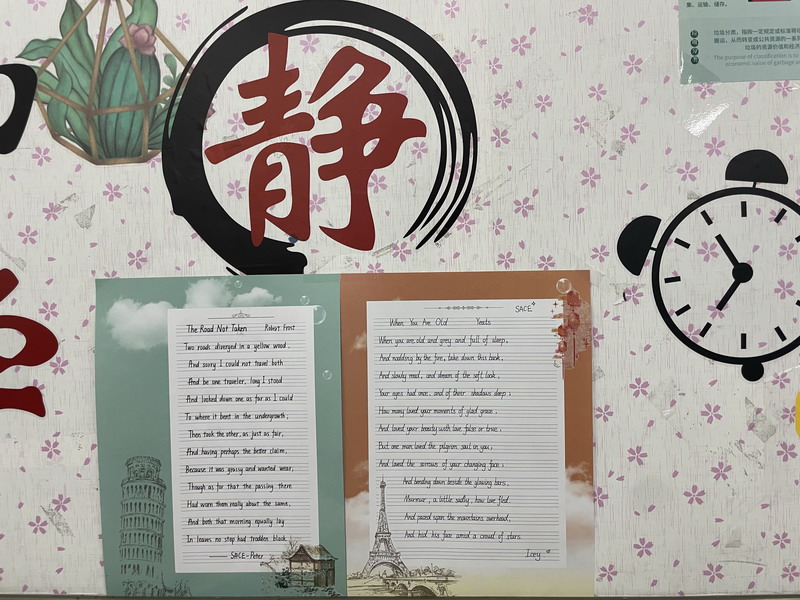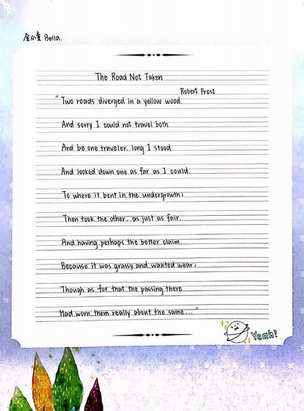 本次英文比赛书写的内容有老师们精心选取的济慈等著名诗人的作品,也有同学们选取自己喜欢的诗歌等,在统一的稿纸上进行设计并书写。在比赛过程中,同学们坐姿端正,挥洒笔墨,精益求精,力求完美。单词书写标准,字迹流畅端正,书面整洁美观,令人赏心悦目。比赛结束后,老师们进行了认真评选,并把优秀的作品展示到班级宣传栏上。