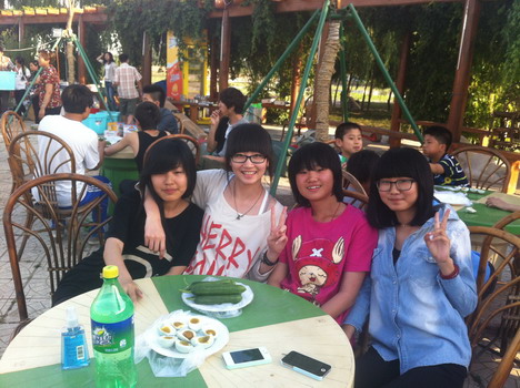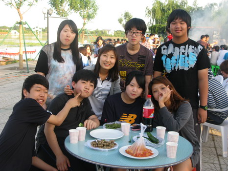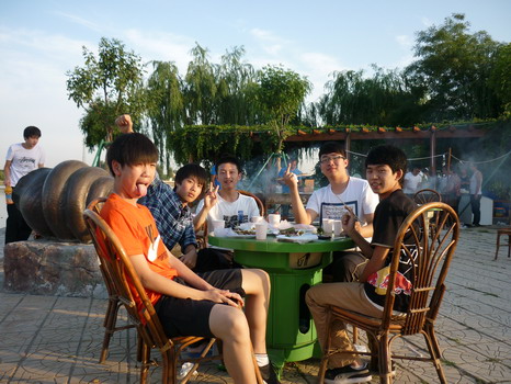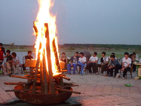 到了晚上,本以为学生们的体力也差不多消耗光了,也就是吃个饭看看风景,但是面对着如此诱人的户外烧烤和篝火,谁又能抵挡得了这美食美景的诱惑呢?学生们吃着聊着,唱着跳着,此时此景真的让我们感觉到世外桃源般惬意。此时太阳早已西下,可这时的景致也更加的宜人。“一道残阳铺水中,半江瑟瑟半江红。” 或许其中的美就在这里。