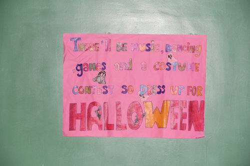 此时此刻,舞会虽然还没有正式开场,但周围的环境已经将人们带到了节日的气氛中:天花板上垂着形状各异的彩条,墙壁上贴了好多有关万圣节的照片和图画,就连墙角也用黑色的棉花丝做成蜘蛛网装饰着,学生和老师装扮的各种角色纷纷亮相,大家不停地拍照。