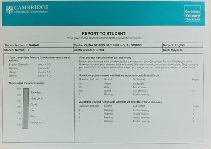 Four Primary 6 students sat in the Cambridge Primary Checkpoint English and Mathematics Examinations on the 18th and 25th of April. They did extremely well. Three students received “Excellent” score in English and also Mathematics (full scores in Math), one student received “very good”.