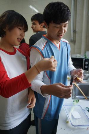 2013年11月22日下午1点,国际汉语部高二全体同学在宿舍区的公共厨房组织了一次丰富多彩的美食分享会。