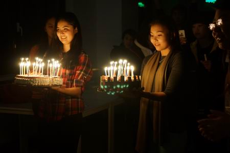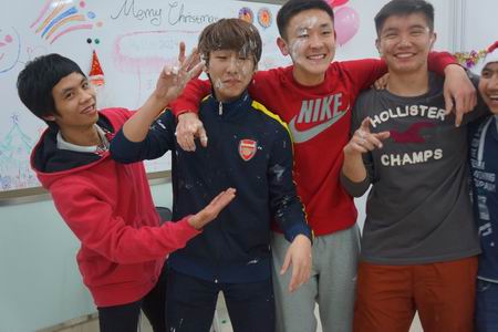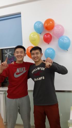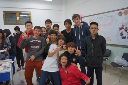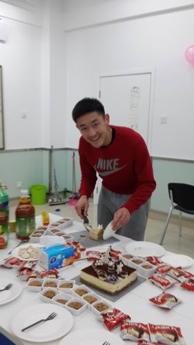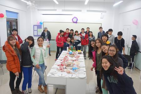 12月24日,外面寒风凛冽,但汉语部高一教室却暖意融融,不断传出欢声笑语。原来,这是大家在为汉语部高一的学生阿戴利和詹贝克同学过17岁的生日。寿星们精心准备了很多蛋糕和饮品,并把汉语部所有学生和老师都请到了高一班的教室。可他们却不知道汉语部所有的师生早就在晚自习后特意为寿星们筹划了一个特大的惊喜——盛大生日派对。
