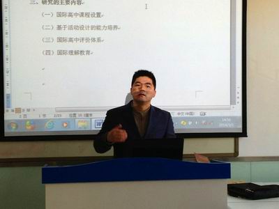 在国际部蒋校长的指导下,2013-2014学年第一学期国际高中部确立了“学生国际化发展教育教学研究”这一课题。在这个大课题之下,国际高中部开展了“课程设置”、“学生能力培养”、“学生评价体系”等一系列子课题的研究,发动每一个教师参与到研究中来。在本次举行的课题研究讨论会中,老师们认真听取了夏主任对课题研究所做出的阶段性总结。经过一个学期的努力,课题研究取得了一定的成效,但也面临着一定的困惑与不足。夏主任也鼓励各位教师们不惧艰辛,敢于面对困难和不足,再接再厉,争取在课题研究上取得更大的成绩。