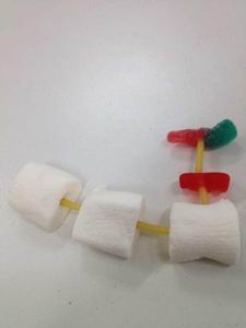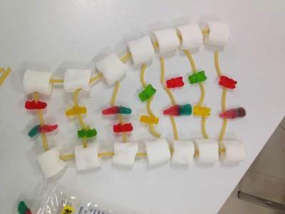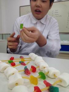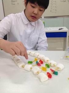 除此之外,为了让学生们更形象地了解DNA 的构成方式,Nathan 老师亲自买来棉花糖和软糖,分发给各组学生,让他们在实践过程中用英语表达自己的亲身体验和感悟;既锻炼了学生们的英语表达能力,又圆了他们做主角的梦想。瞧!大家做得多认真、多形象啊!