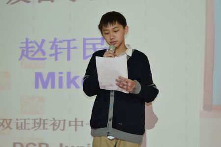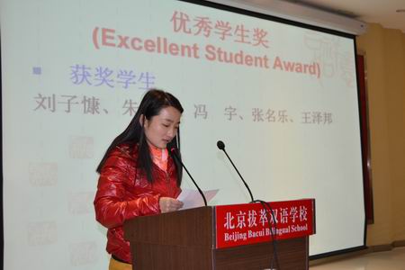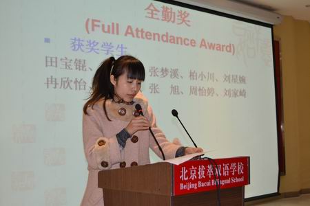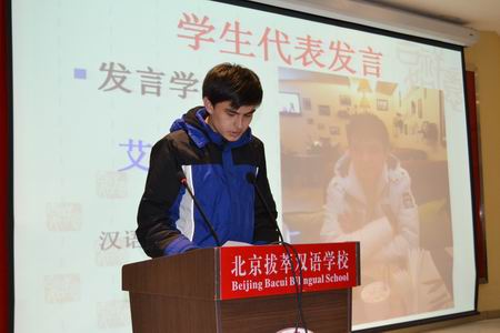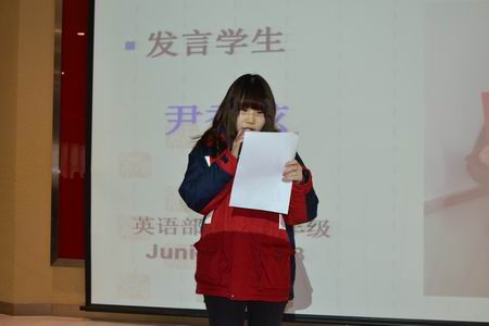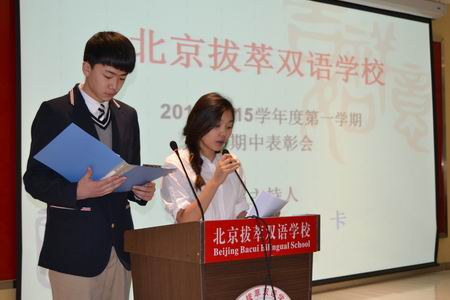 12月11日下午,国际部全体师生在图书馆报告厅隆重举行了期中表彰大会。本次表彰大会由汉语部学生因卡和国高部学生赵泽龙主持,他们以流畅自如、纯正地道的中英文双语开场白拉开了大会的序幕。
