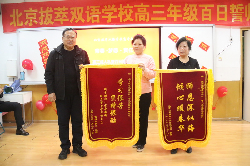 在高考百日冲刺的关键节点,于子洋同学的家长作为家长代表发言。百日征程,父母从监督者转变成陪伴者,用情感陪伴消解焦虑,用心灵共鸣书写最长情的告白。家校默契如双翼共振,以信任为基石,以沟通为纽带,以理性为明灯,共同筑就成长阶梯。宫婧芮妈妈为高三教师团队和全体同学送上锦旗,闫书记、张校长代表学校从家长手中接到锦旗,并向家长表示由衷的感谢!