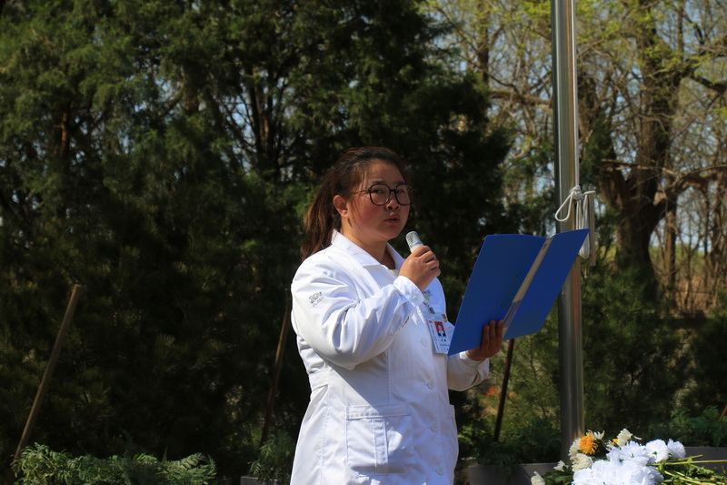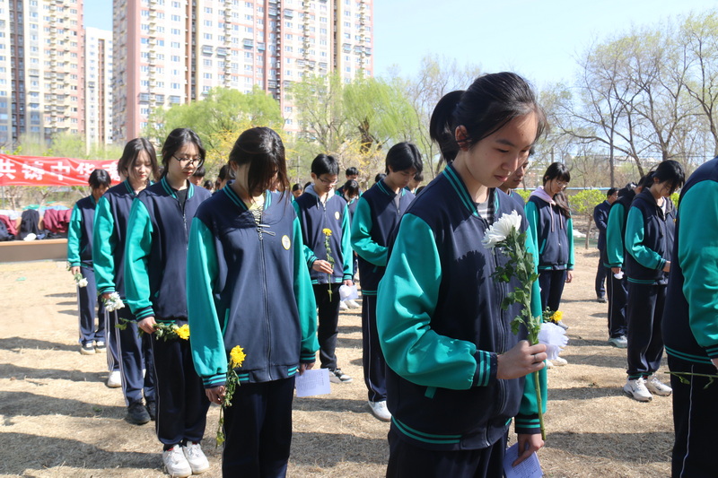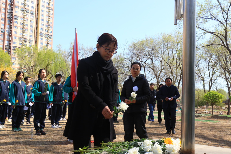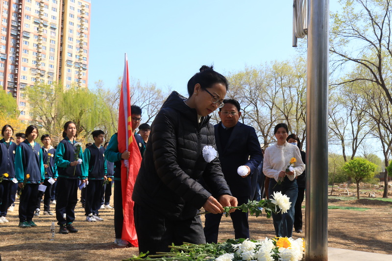 师生低头默哀,鞠躬致敬,用鲜花寄托哀思,用誓言告慰英魂,深情缅怀革命先烈。默哀毕,全体师生在闫书记和黄主任的带领下,手捧花朵,将寄托思念的菊花摆放在迎风飘扬的五星红旗下。