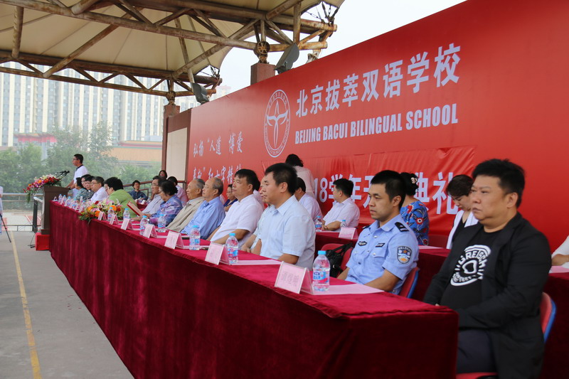 国家总督学顾问、教育部原副部长、北京拔萃双语学校顾问柳斌,中国红十字会总会事业发展中心顾问、人民日报社原副总编辑陈俊宏,中国红十字会总会事业发展中心顾问、北京市委组织部原常务副部长史绍洁,中央党校中国领导科学杂志社美术总编、清华大学中国产业经济发展研究中心艺术委员会主席谢飞,全国人大画院院长李林君,中国红十字会总会事业发展中心主任江丹,中国红十字会总会事业发展中心副主任魏国,北京市朝阳区社会力量办学管理所党总支书记兼所长刘笑峰,朝阳公安分局平房派出所副所长屈波,爱心企业家代表非洲中国矿业公司董事长张健,北京柏丰置业有限公司总裁谭煜明莅临学校参加开学典礼。名誉校长江泽玲非常关心我校的发展,也参加了此次开学典礼。
