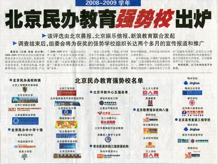 2008-2009学年,谁是北京民办教育强势学校?5月中旬,北京晨报、北京娱乐信报、新浪教育联合发起强势校的调查活动。活动举办单位根据读者短信投票结果,并结合教育专家的意见,本着推选权威、优质教育机构、宁缺毋滥的原则,产生了2008-2009学年“北京民办中小学十强”,我校位列其中。