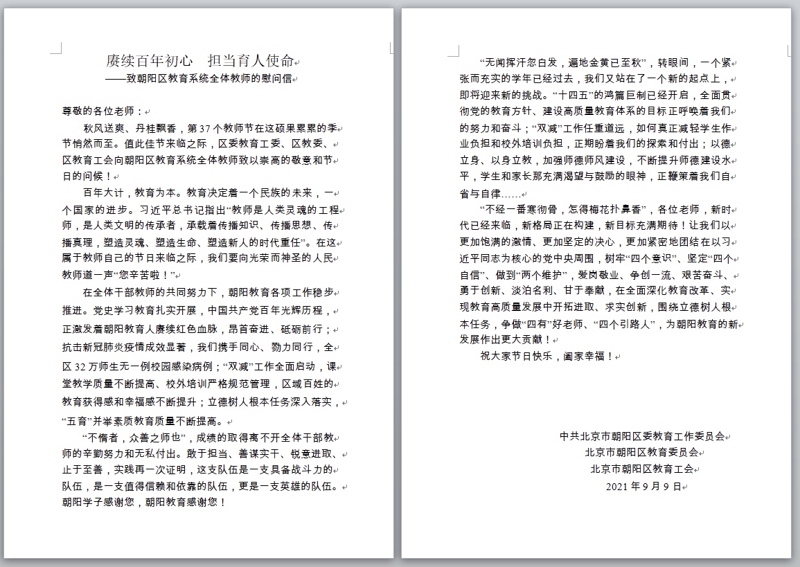 赓续百年初心 担当育人使命 ——致朝阳区教育系统全体教师的慰问信 来源:校办 发布时间:2021-09-09 16:20:47 浏览次数: 次 【字体:小 大】 点赞 收藏 分享到: 【打印正文】 相关内容