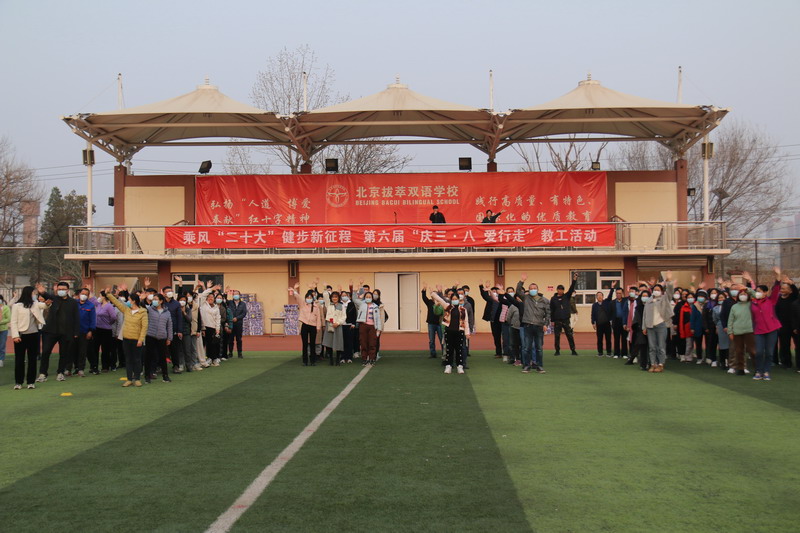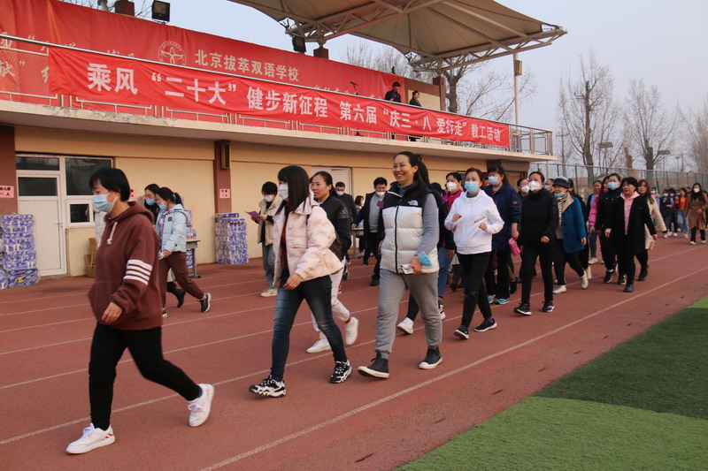 为深入学习贯彻落实党的二十大精神,丰富广大教职工文化生活,进一步倡导文明健康的生活方式,增强教职工的身体素质,以蓬勃向上的精神,昂扬进取的斗志迎接建校二十周年,在全国“两会”胜利召开之际,在我国第100个妇女节到来之际,北京拔萃双语学校工会委员会于2023年3月7日举办了“乘风‘二十大’ 健步新征程”第六届“庆‘三•八’爱行走”教职工健步走活动。200多名教职工参加了此次活动。