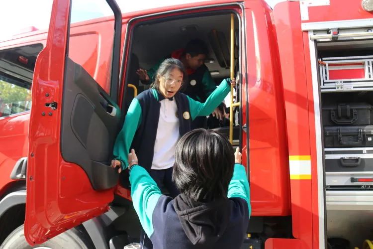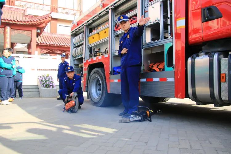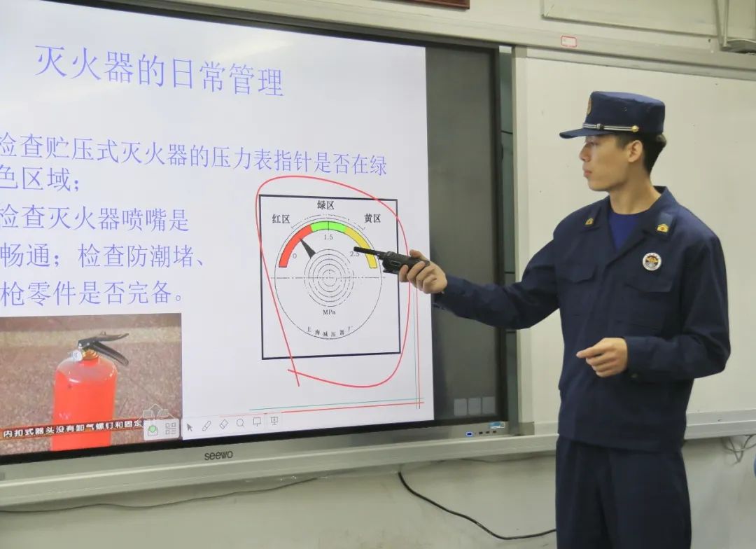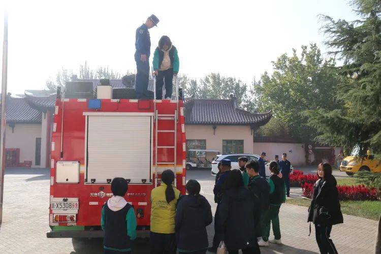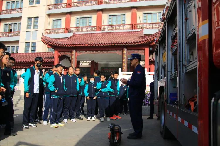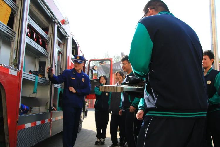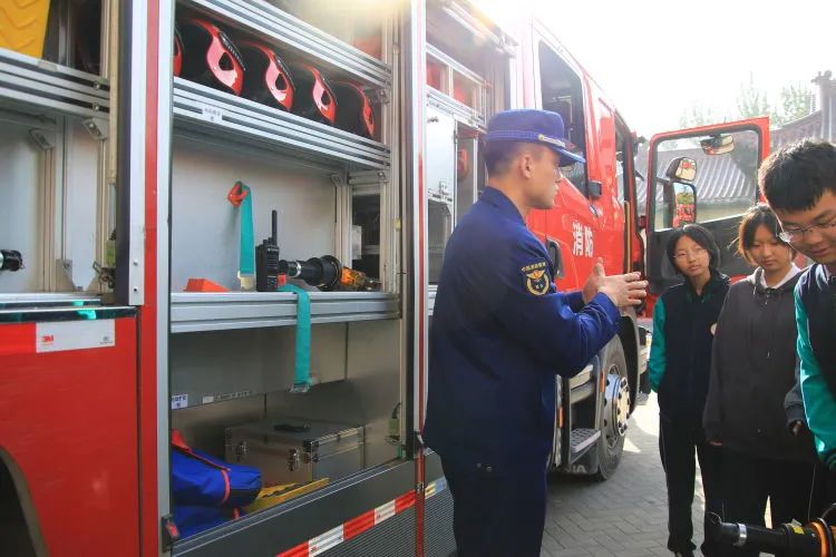 在老师的组织下,同学们积极参与消防器材使用培训。教官给同学们讲解消防器材的使用方法,介绍了具体的操作步骤,并现场进行了演示,还带领同学们进入消防车内参观,亲身体验消防车内的复杂结构。