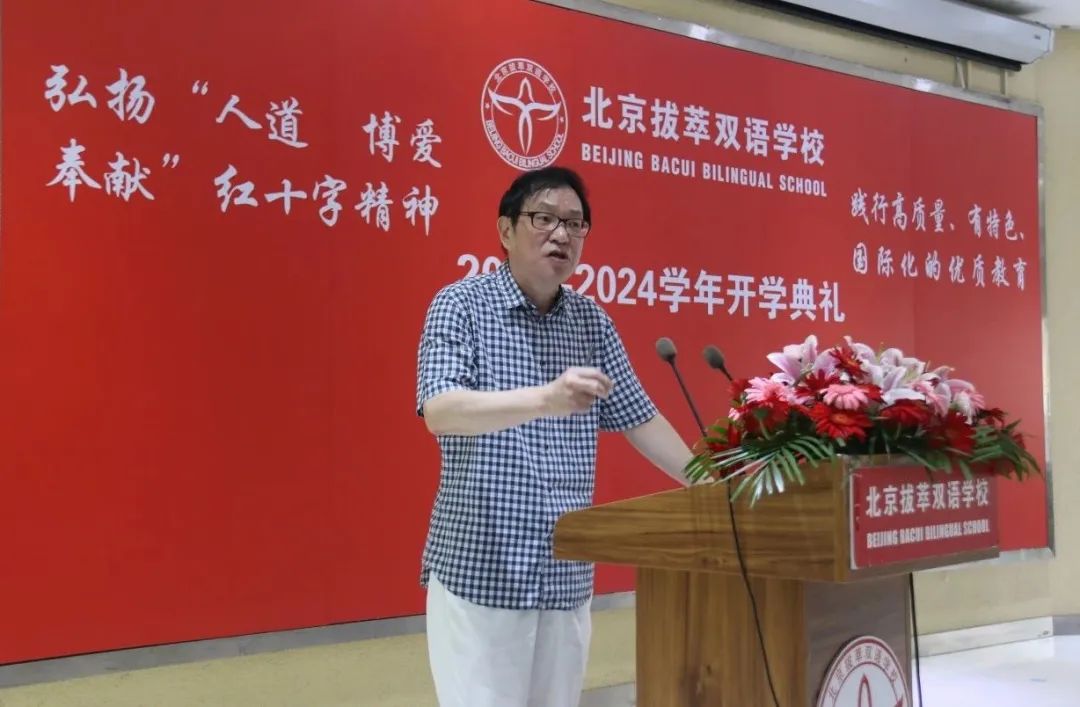 开学典礼上,中国红十字会总会事业发展中心主任江丹对拔萃全体老师们致以了崇高的敬意和节日的祝福,并在讲话中对北京拔萃教育教学工作,提出了四点希望:一是落实立德树人。学校要坚持优秀传统文化和现代文明规范教育相结合,根据不同阶段学生特点,在开设中华传统文化课程,强化传统美德的同时,提高社会公德与日常行为规范相融相通,更好落实立德树人的教育根本任务。