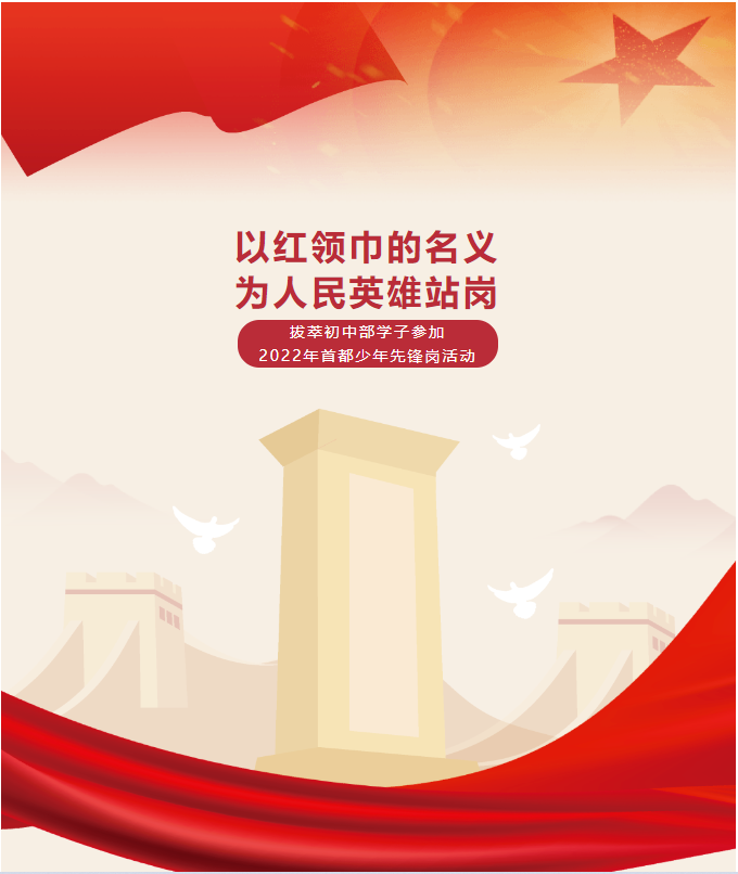 为喜迎党的二十大,庆祝中国共产主义青年团成立100周年,进一步引导我校少先队员缅怀革命先烈,传承红色基因,国庆期间,我校初中部24名少先队员前往天安门广场,来到人民英雄纪念碑前,执行2022年“首都少年先锋岗”站岗任务。