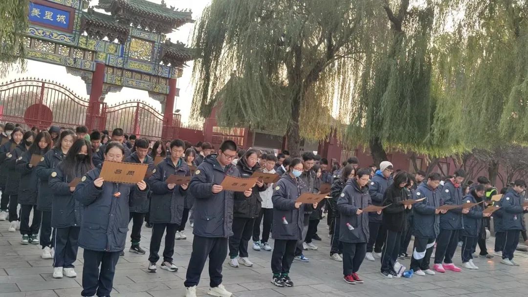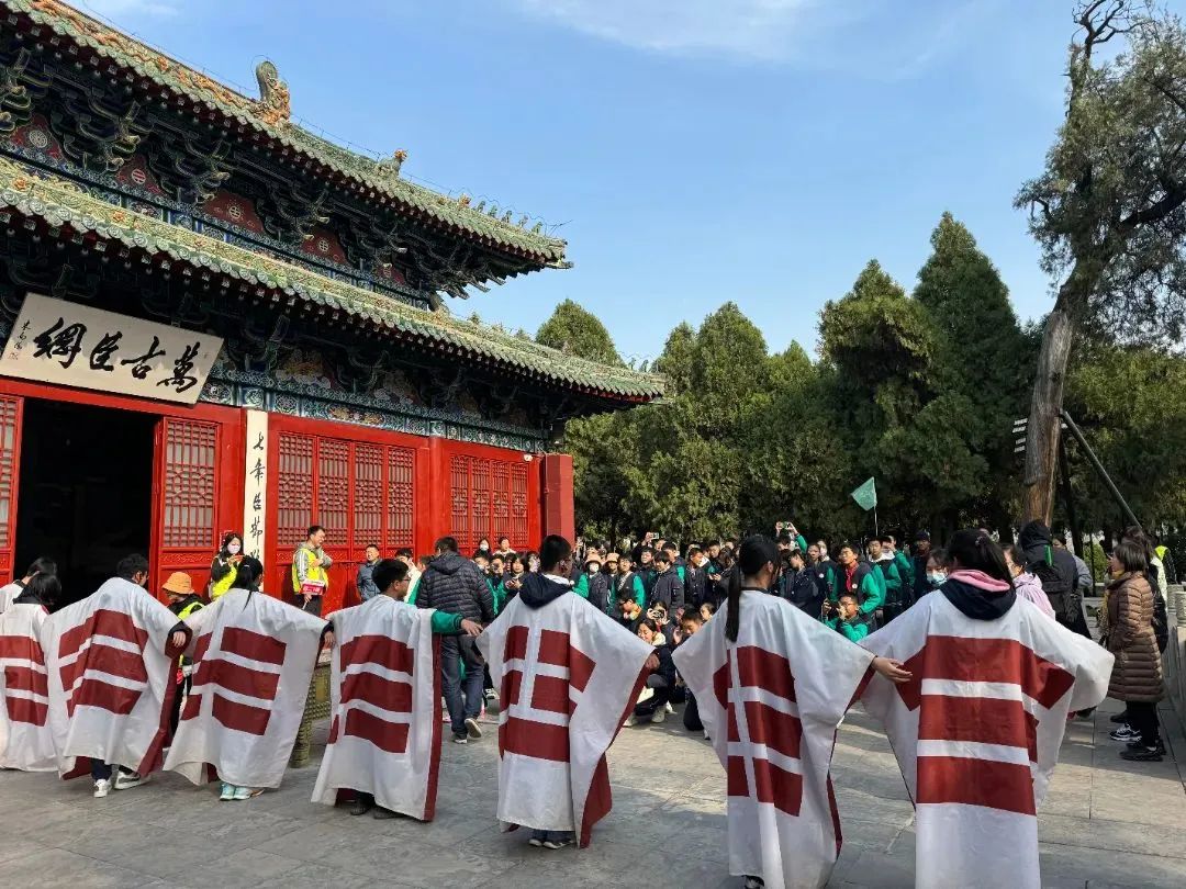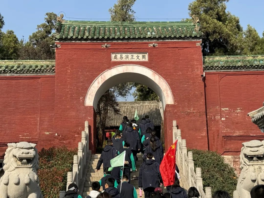 探周易之源,访羑里古城。羌里城遗址,周易文发祥地,以博大精深的文化内涵而名扬海内外。同学们在这里学习祭拜礼仪,面向高大的周文王雕像齐诵时光仿佛一下子穿越回三千年前,他们认真学习拱手、鞠躬、行礼,表达对周文王的敬仰之情。