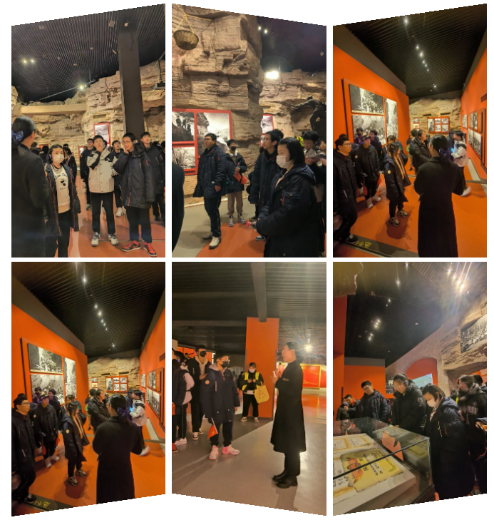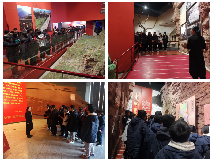 同学们看着馆内的绘画、实物、雕塑、影像,认真参观并仔细聆听纪念馆讲解员讲述红旗渠修建前林县人民的生活状况,对比艰苦的过去,了解当下幸福生活的可贵,以足迹感知先辈们“自力更生、艰苦创业、团结协作、无私奉献”的红旗渠精神。
