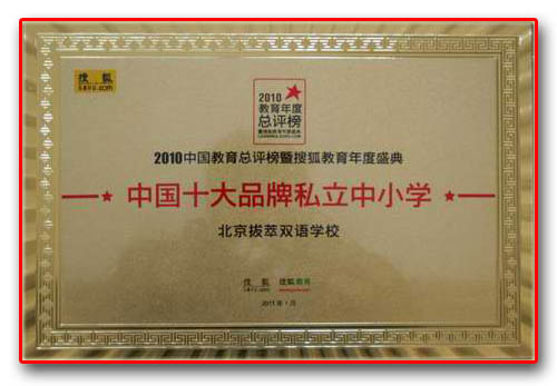 我校获评“中国十大品牌私立中小学”。请看社会对我校的评价——在探索多元教育理念、办学模式方面作出了让人尊敬的贡献,为社会提供了更多、更好、更有效率也更公平的教育服务,满足了学生和家庭在专业、地域、收费水平等方面多样化的教育需求!在“教育改变中国”的过程中,树立了良好的口碑,交出了社会满意的答卷!