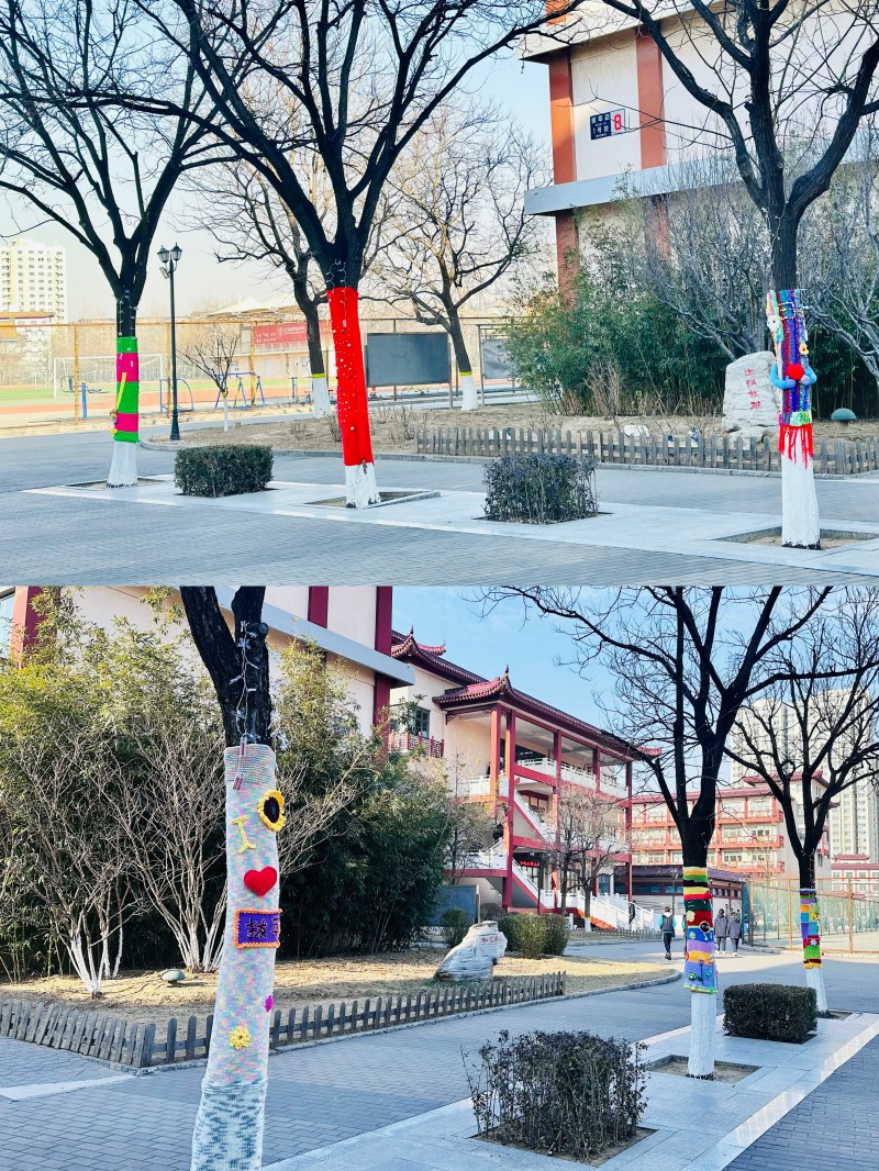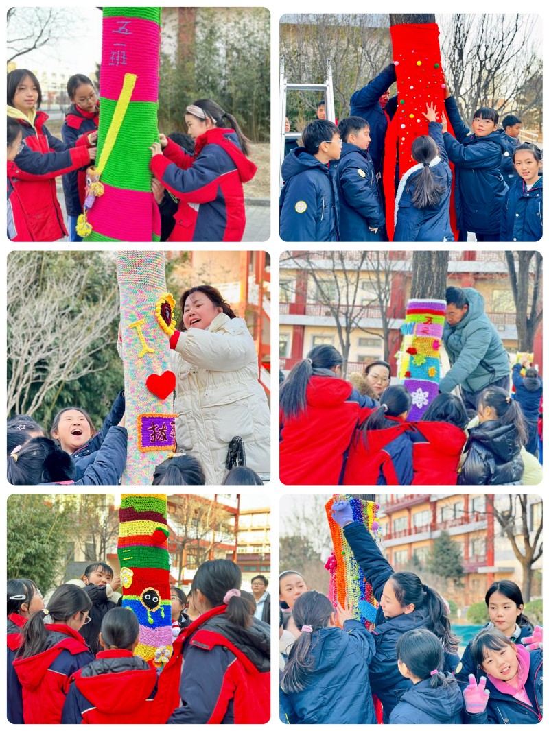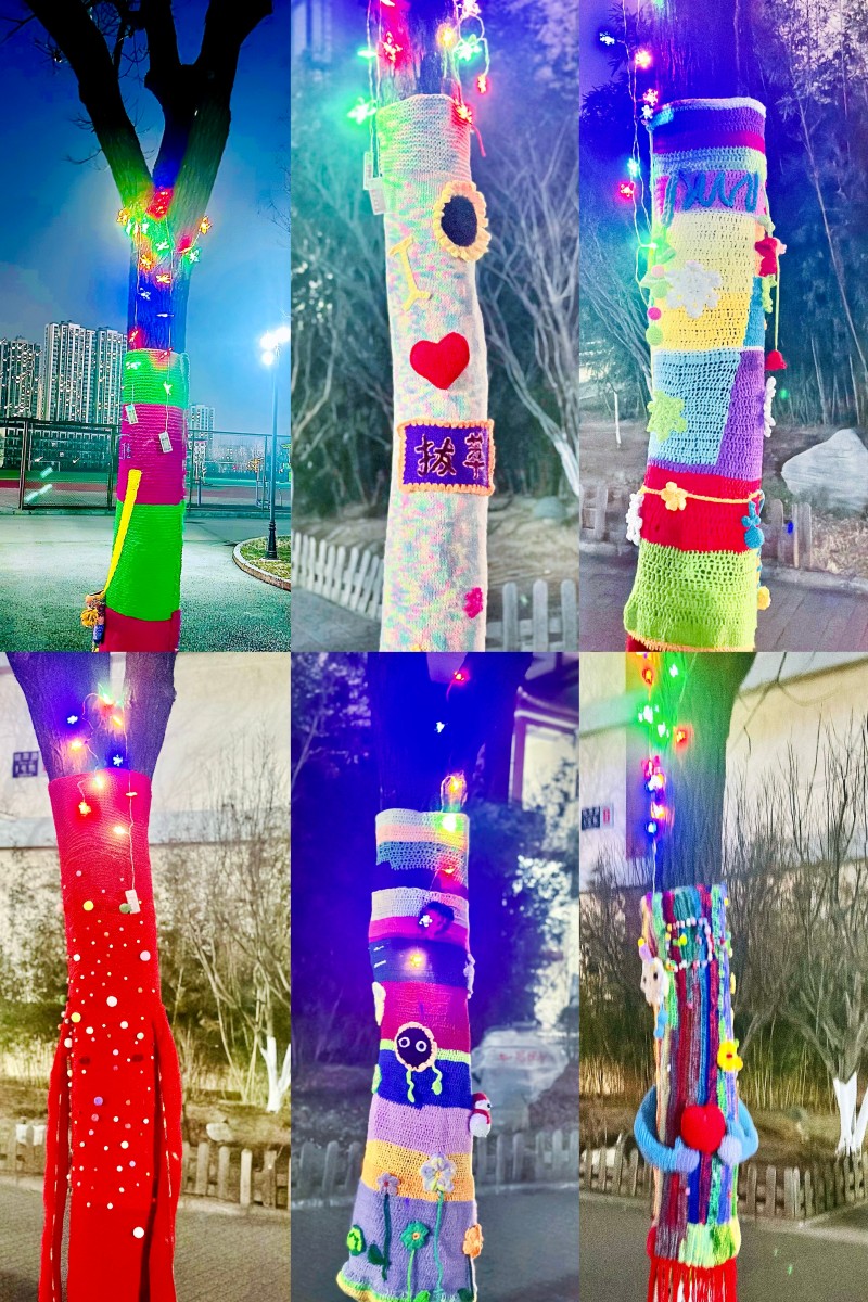 随着毛衣的逐渐成形,活动迎来了高潮。同学们带着自己亲手编织的“温暖外套”,为校园中的树木一一披上。现场气氛热烈非凡,师生们共同参与,为树木系上保暖绳,挂上自制的小装饰品,并与大树亲密合影。这一刻,校园仿佛变成了一个充满爱与温暖的大家庭,每一棵大树都成为了这个家庭中的一份子。